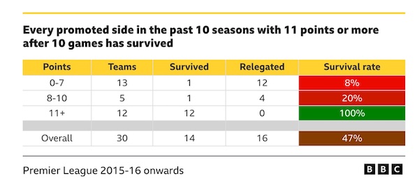 過去10シーズンの昇格チームで、開幕10試合で11ポイント以上を獲得した12チームは、全て残留を果たしています。